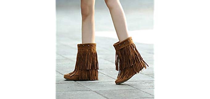 Inornever Suede Fringe Moccasin Boots Mid Calf Women's Round Toe Flat Heel Ladies Winter Fashion Snow Booties Yellow 9 B (M) US - Moccasin Boot